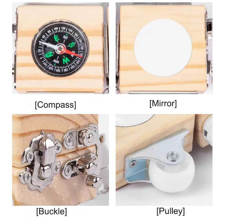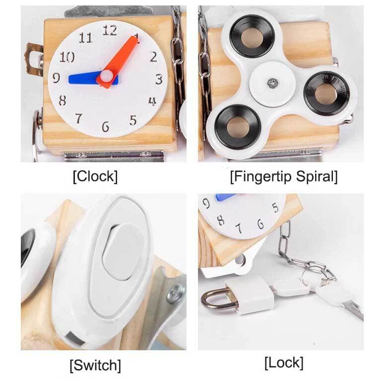 Cool 7-in-1 Activity Cognitive Toy. This wooden busy box is a mix of fingertip gyroscope, spring bolt, switch, wheel, screw cap, water tap, key/lock. Each gameplay is closely related to life, making kids learn basic skills and develop their cognitive skills during playtime.